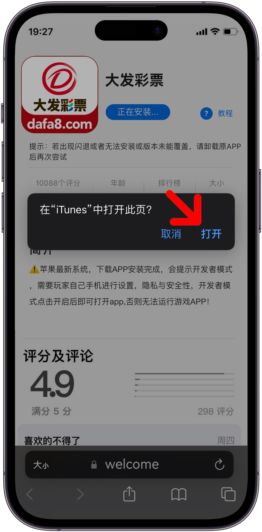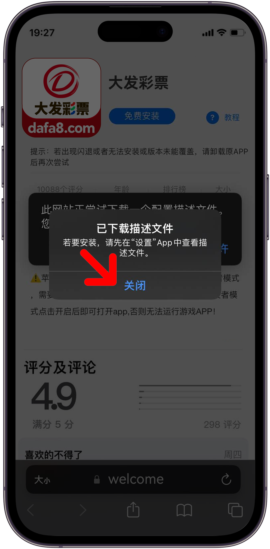 1. 手机访问dafa8.com, 点击苹果版本下载, 在新窗口点击"免费安装" (如上图所示)